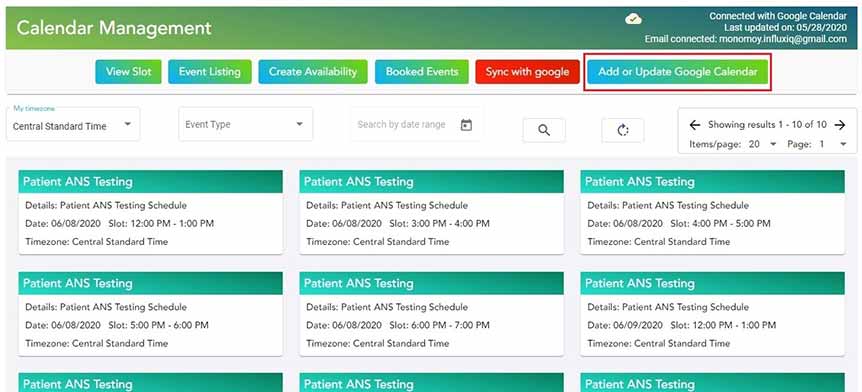 Calendar Management functions are exclusive to Technicians. Technicians can Add or Update Google Calendar to their PECE Virtual Platform Back-office through Dashboard-->Manage Schedule-->Add or Update Google Calendar.