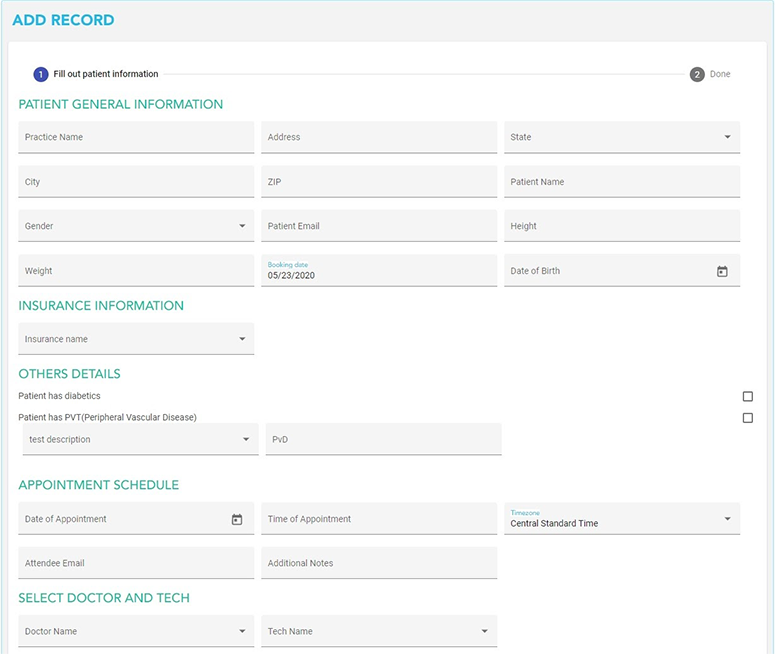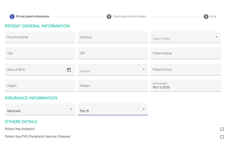The Doctor’s Office must enter the necessary Patient General Information, Insurance Information, the Patient’s Diabetic, and PVD (Peripheral Vascular Disease) status, the Appointment Schedule, and select the Doctor and Tech.