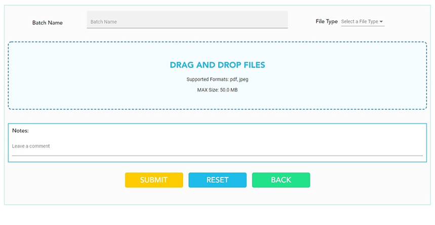 The Technician must enter a Batch Name and select the Type of Report, followed by adding the Patient Reports in the “DRAG AND DROP FILES” section. Med-Tech must then add necessary Notes and click the SUBMIT button, which will redirect Technician to the Patient Mapping Confirmation Page.