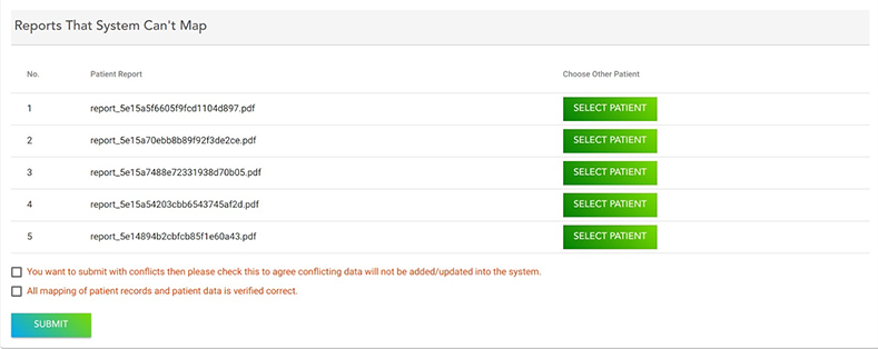 Once Mapping is completed, Technician must select the two Check-boxes ( ) and click on the SUBMIT button to successfully Upload Patient Reports in Bulk.