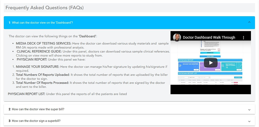 A Doctor can View FAQs on their PECE Virtual Platform Back-office at Dashboard-->FAQ and click on the questions from the FAQ list, which will open a slide with the answer to the question accompanied by a video.