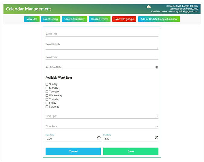 Technicians can Manage their Availability by clicking on the Create Availability redirect them to the Create Availability / Event Form.