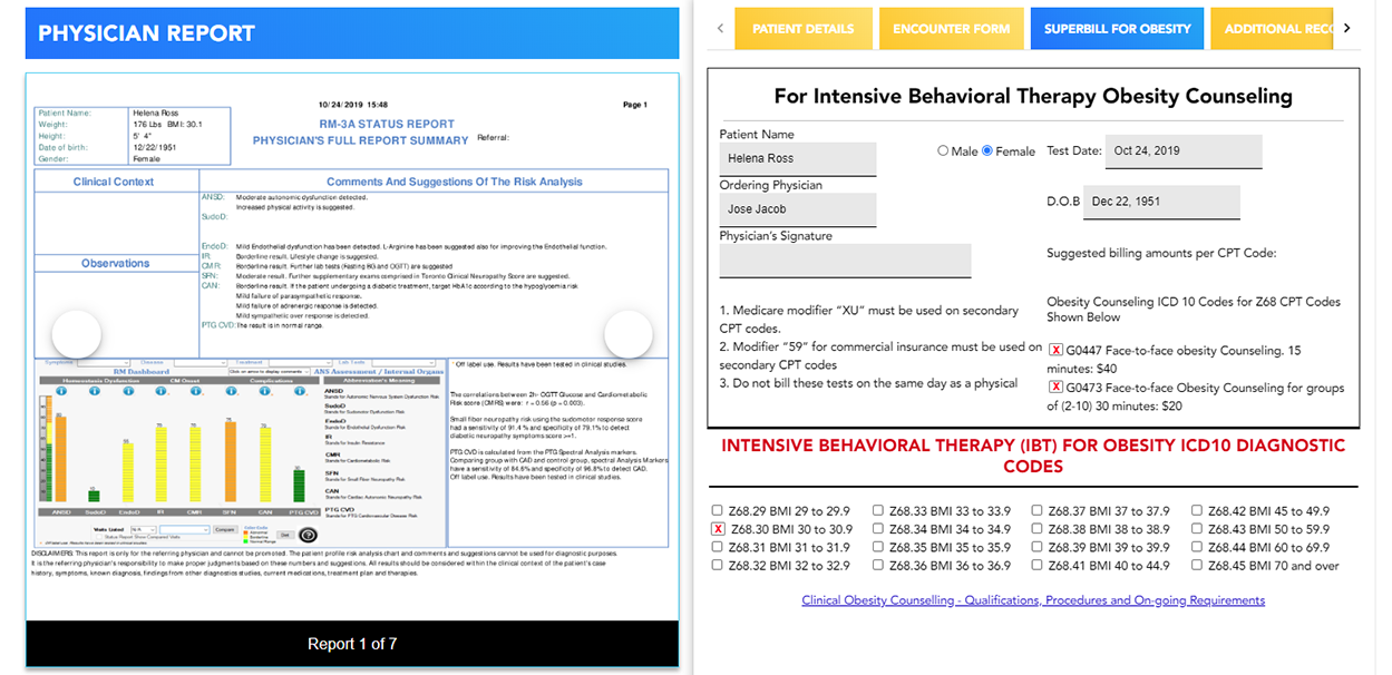 The Doctor can View and Sign Intensive Behavioral Therapy (Superbill for Obesity) (which is generated only when the BMI on Patient Clinical Report is above 29.1) by clicking on the [VIEW] button against a particular Patient Report in the PHYSICIAN REPORT LIST section on the Doctor Dashboard in the PECE Virtual Platform Back-office, and then clicking on the SUPERBILL FOR OBESITY.