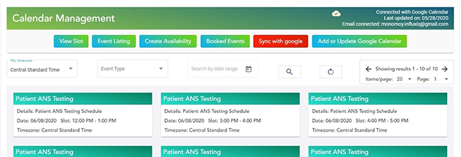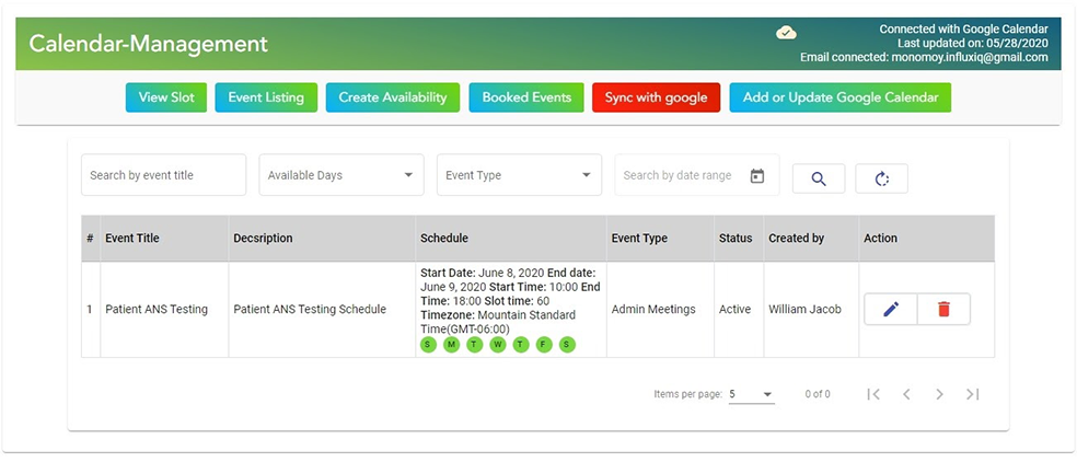 The Technician can then view their Event Listing by clicking on the Event Listing button, which will redirect them to the Event Listing Page, where they can search for, view, and manage the availability events.